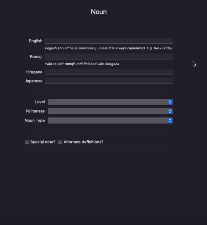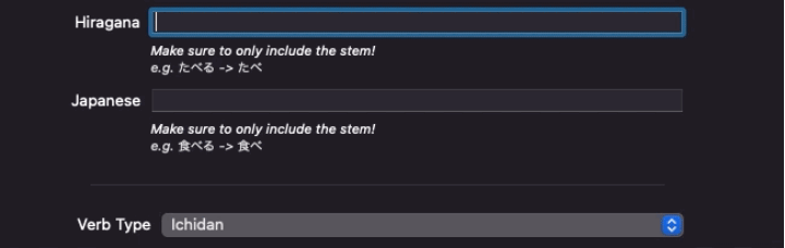 Added auto-detection of common typing errors, such as including conjugations for verb stems (i.e. writing 食べる instead of 食べ)
