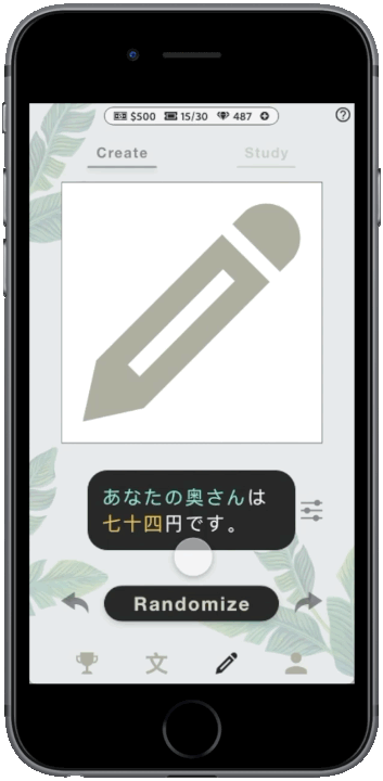 The random sentence generator pulls vocabulary words and sentence structures from the user’s database, and then generates a random grammatically-correct sentence. Users can also filter the generator to practice specific levels, conversation topics, and grammar types.